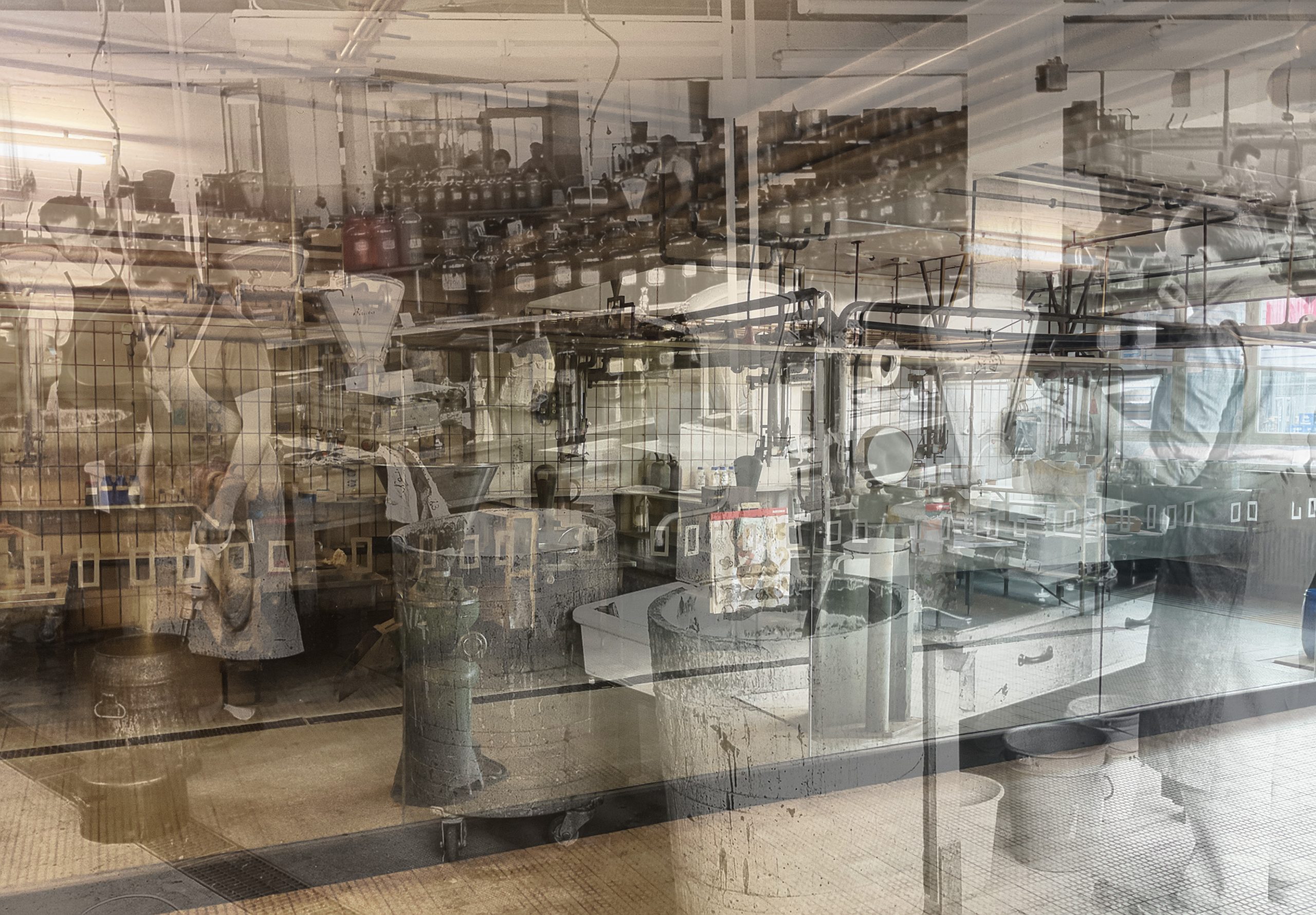 Anlässlich des 100jährigen Bestehens der GEDOK wurden die Mitglieder eingeladen, sich mit der traditionsreichen Geschichte der Pausa auseinanderzusetzen. Hier wurden Stoffe für das Bauhaus bedruckt und namhafte Künstler wie HAP Grieshaber entwarfen Motive. Im dritten Reich leisteten die Beschäftigten Widerstand gegen die Nazis, um die jüdischen Firmeneigentümer zu schützen. Mein Beitrag umfasst 8 Arbeiten mit dem Titel „Zeitgewebe“, in denen ich historische Aufnahmen mit aktuellen Fotografien überlagere, die am selben Ort aufgenommen wurden.